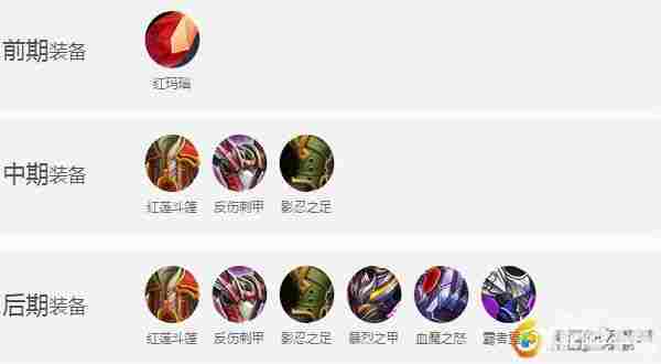 后期:红莲斗篷、影忍之足、反伤刺甲、暴烈之甲、血魔之怒、霸者重装