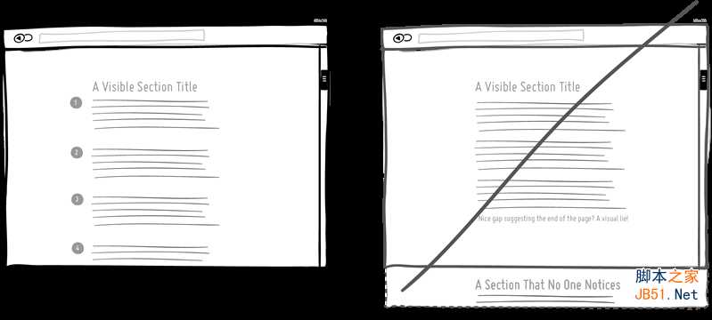 “内容结束”的假象是转化率的杀手。特别是在长页面中那些段落分隔的地方,当心不要让用户觉得内容已经结束掉了。试着确定一种视觉模式与节奏,让用户可以得到明确的指引,持续阅读内容。对于有可能出现在“折现”位置的留白或内容间距,要确保它们的尺寸不会过大。