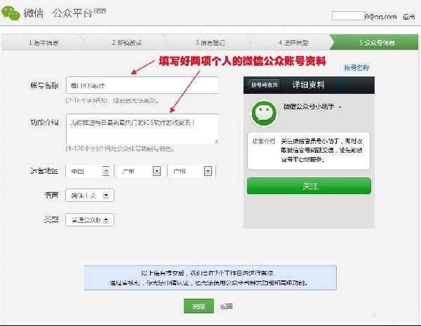 第五步:填写微信公众账号的信息,这里就根据个人的实际情况来填写。填写好的账号名称后粉丝就能直接在微信搜索你的名称找到你啦。例如你搜索开淘网就能找到开淘网啦