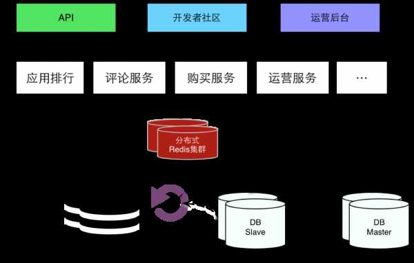 API提供接口给手机端应用商店使用,主要是读取榜单数据展示给用户看,这部分“读”我们基本是从缓存读取,对数据库的依赖都很小;再就是少量的“写”来自一些统计信息、评论等。