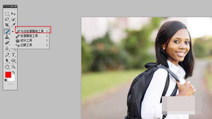 6、按快捷键ctrl+shift+alt+e盖印图层,选择“污点修复画笔工具”,去除人物上的污点。