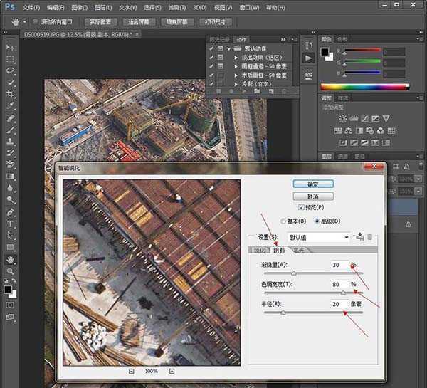 5、然后点击下面的阴影,将渐隐量设置为30,色调宽度设置为80,半径设置为20
