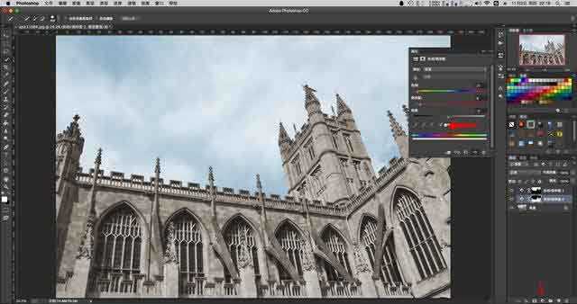 接下来给建筑上色。同理用选区工具选中建筑部分,这里分享一个小技巧:点击上一步创建蒙版图层的蒙版(就是上白下黑的那个)用“快速选择工具”再次在天空部分拖动,你会发现之前天空的选区会很轻易的再次出现,这时候右键 — 选择返向,建筑部分就会被选中。