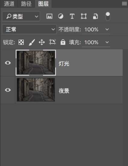 使用快捷键Ctrl+J复制图层,将下方图层命名为"夜景",上方图层命名为"灯光"。