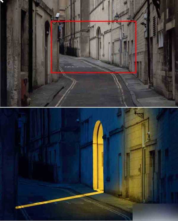 首先在街灯的灯泡上使用小画笔描绘出灯泡亮灯的效果,然后改换大尺寸画笔绘制出灯光在墙面上的照明效果。(注意模拟出灯光渐远渐弱的感觉)