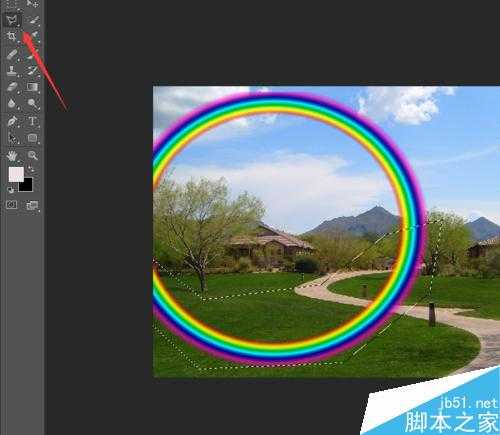 这时会得到一个七彩色的圆环,然后使用多边形套索工具,框住下半部分的圆环。
