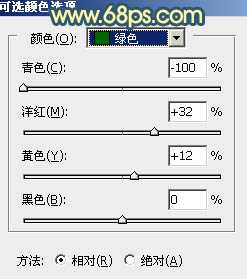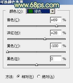 1、打开素材图片,创建可选颜色调整图层,对绿色进行调整,参数及效果如下图。这一步把图片中的绿色转为青绿色。