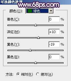 1、打开素材图片,创建可选颜色调整图层,对黄色,绿色进行调整,参数及效果如下图。这一步把图片中的黄绿色转为橙黄色。