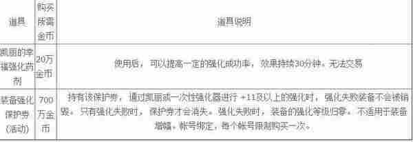 活动期间,在凯丽处可以用金币购买【凯丽的幸福强化药剂】&【装备强化保护券 (活动)】。