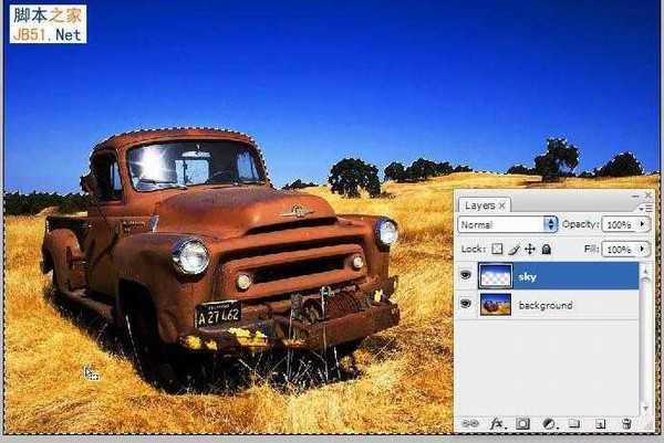 1、打开素材,为了体现你很专业,也为了更好的效果,照片可以分成三个图层–‘sky’,‘car’和‘grass&tree’。
