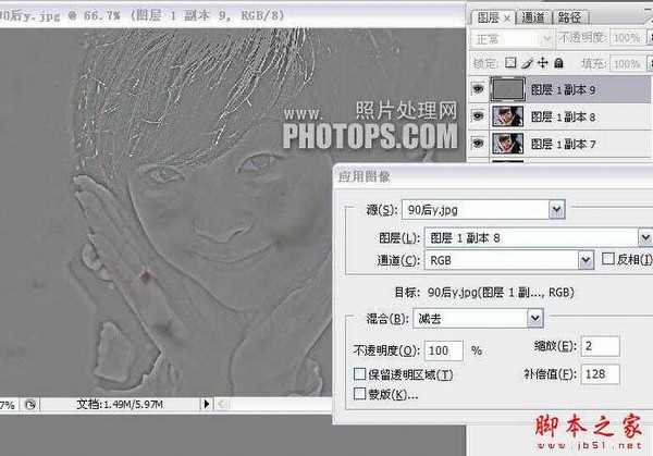 非常暗的人物图片调亮后,人物脸部及肤色部分会有很多噪点,选择合适的磨皮方法,可以完美去除这些噪点。这里介绍一种非常不错的高低频磨皮,有点类似通道磨皮,不过高低频相对要智能很多。操作的时候需要把较色后的图片复制,适当模糊处理做成低频层,然后用应用图像得出所需的高频层,再修改混合模式就可以快速消除肤色部分的噪点。