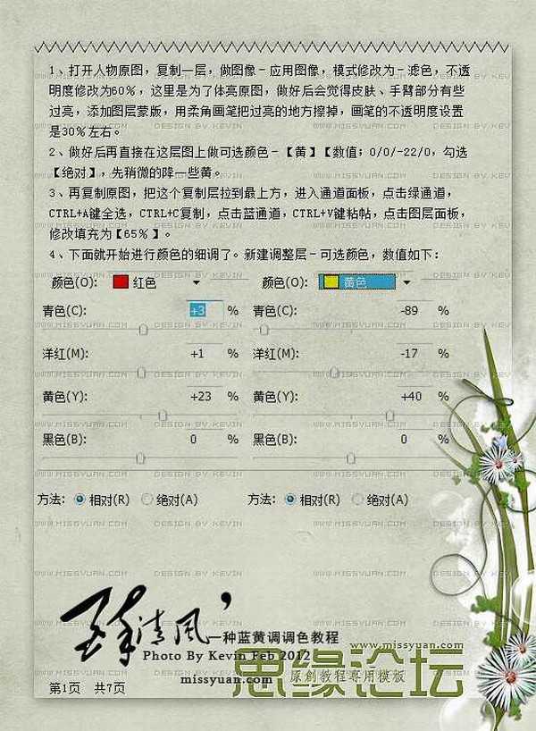 2、左后执行在这层涂上执行:图像 > 调整 > 可选颜色,选择黄:数值:0/0/-22/0,勾选绝对,先稍微降一些黄色。