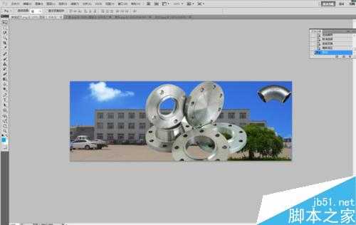 我们挪过来之后发现广告这样子比较单调,那么我们现在再把产品挪过来,在挪产品的时候我们注意一下,弯头我们依旧可以采用磁性套索工具,但是法兰不行啊,它内部还有空白啊,这个我们就需要用到魔棒工具,