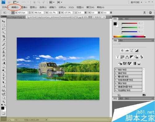 再打开另外一张草原图片,将勾选出来的“汽车”放入去,将汽车和草原融为一张图片,如下图所示: