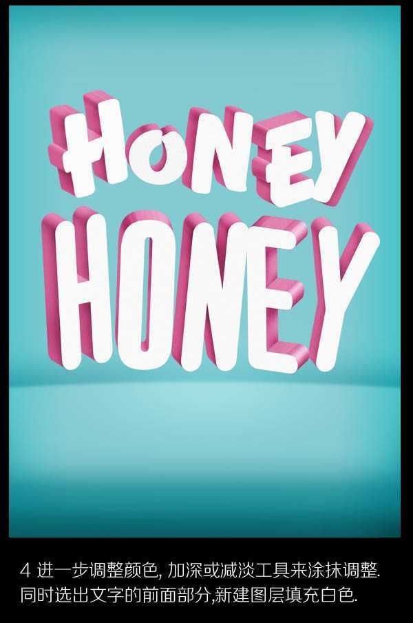 4、进一步调整颜色,加深或减淡工具来涂抹调整。同时选出文字的前面部分,新建图层填充白色。