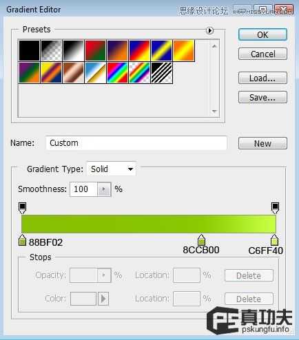 还是老样子,又要开始我们的重复过程了,相信我,这不是繁琐的工作,只会让你更熟悉更了解你现在做的。使用图层样式来填充颜色:图层样式—渐变叠加(功夫有话:希望每做完一步大家都能好好想想这步的目的是什么,怎么做的,作者为什么这么做?包括下面作者颜色方面的设置和处理等等)