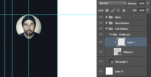 然后利用椭圆工具,摁住Shift,绘制大小100x100px的圆形,移到左数第三条参考线的中间,上边紧贴水平参考线,如图: