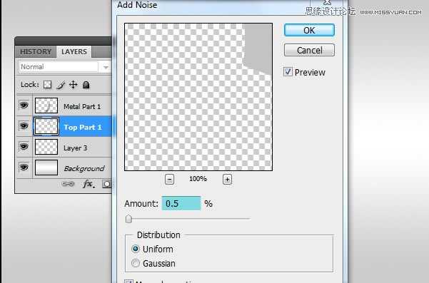 Step 9: 创建上面部分 创建一个新层 (Command/Ctrl + Shift + N) 创建一个路径(P)想下面图片所示的那样。 填充路径,使用一个亮灰色 (#c3c3c1) 滤镜 噪点 添加噪点 使用下图的设置 创建一个新层(Command/Ctrl + Shi