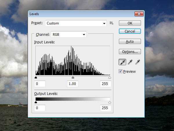 9、添加白云,使用:图像>调整>色阶。打开对话框找到3根吸管,点击的黑色的吸管图标,然后点击图片中最暗的部分,接下来,换成白色吸管,点击图片最亮的地方。