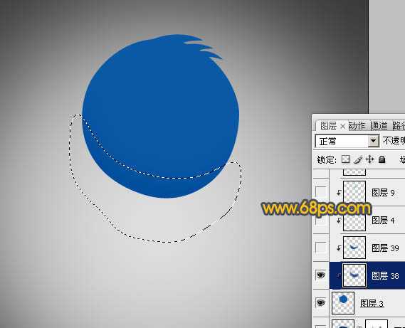 3、新建一个图层,按Ctrl + Alt + G 与前一图层编组,然后在当前图层下面新建一个图层,用钢笔勾出下图所示的选区,按Ctrl + Alt + D 羽化15个像素后填充颜色:#004D9D。