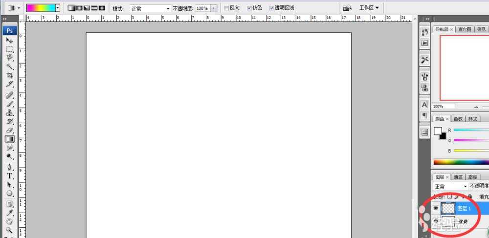 2、如图点击渐变工具,编辑渐变颜色。我编辑了不透明度均为100%的品红、黄、青三色的渐变。选择线性渐变,从左上角往右下角拉一根线,图层1呈现品红-黄-青三色渐变啦。