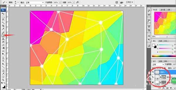 6、接着创建新图层2,用画笔工具在线段相交点画上白色圆点。接着调低图层2的不透明度,白色圆点看上去更柔和了,再合并所有的形状图层。