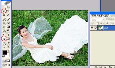 4、隐藏图层1,回到背景图层,用钢笔工具或套索工具勾出透明的婚纱,我们着重要处理的也是这透明部分了。