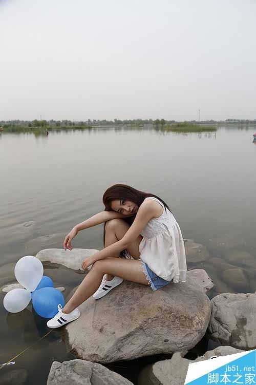 渐变滤镜:让人物石头偏暖色,跟水面天空形成冷暖对比。