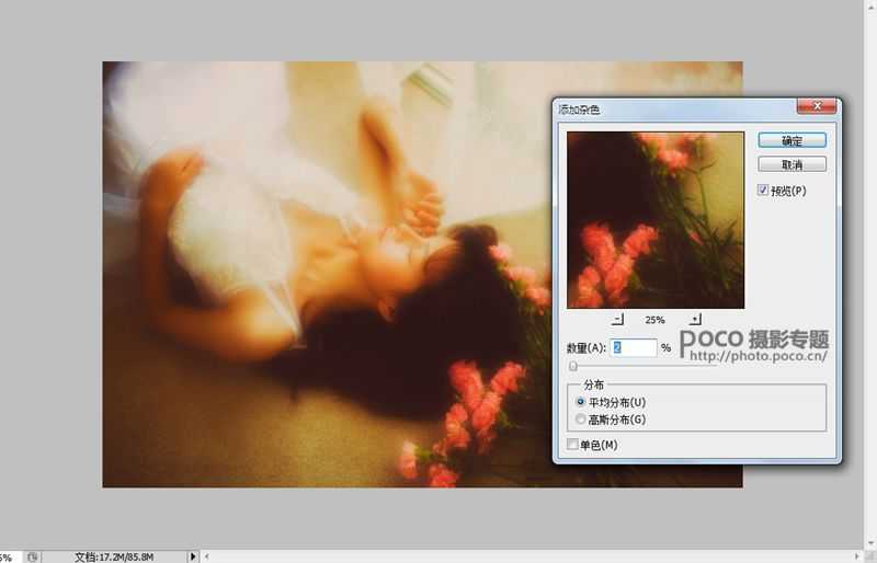 然后将这个图层的不透明度改为59%。最后合并图层后,选择滤镜——杂色——添加杂色2%,制造胶片的颗粒感。