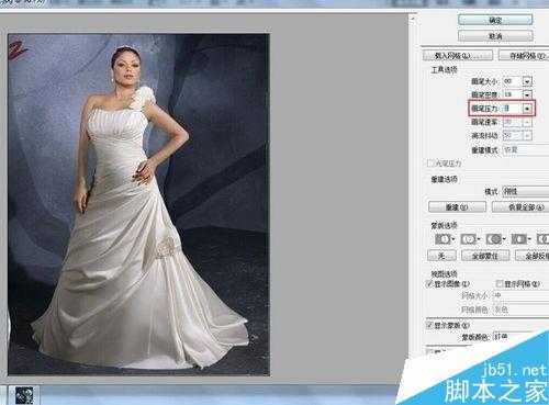 我们点击向前推进工具,在图像上进行托拽,可以廋身、蓬松头发、提臀等操作,还可以做其他的特效。新手的话一般把画笔压力设置在50-60就比较好操作些。如果错了也可以点击重建或者恢复全部。然后你把这张图和上面那张图对比下,你就会知道她廋了很多。