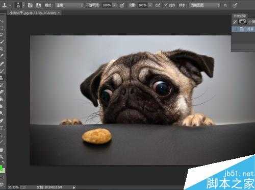 第二步,我们成功将一张小狗饼干的图片插入到ps中,下面我们将用仿制图章工具的制造出更多的饼干给小狗吃。