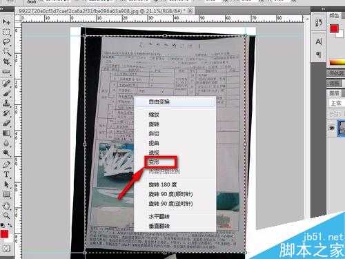 由于我们这张图实在是变形的有点厉害,我们现在需要利用变形工具把他拉回来,再次点击鼠标右键,在弹出来的对话框内点击“变形”选项,如下图所示: