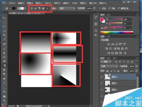 2、新建一个文档。首先了解一下渐变工具中一共有五个渐变样式,可以在文档中挨个用一个下,考虑一下适合什么时候使用。