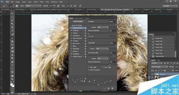 3. 设置完以后就开始在照片上画雪花啦!一定要注意尽量分多个图层(我画了4层),每个图层用不同的笔刷大小画(这样是让雪花更有层次感更逼真)。
