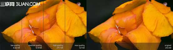 当你在保存图片的时候,有几种网页格式预设可供选择。对于一张图片,你应该考虑是使用JPEG 低、JPEG 中,还是JPEG高。观察下面的对比图,(可以)发现案例中的图片经过压缩后并没有多大的品质损耗。相比起超过250KB的源文件,我们选择中等质量或者高等质量的压缩预设就能够得到一个大小不超过30KB,并有合适品质的图片。