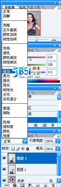 16、取消选择。按Ctrl+D键。然后把布料图层的模式改为叠加。也有用正片叠底的。都可以。看情况吧!如果你做的明暗关系图比较暗的话就叠加。如果亮的话就正片叠底。不过不是必须这样,因为我们这时候也可以把衣服选区载入原人物图,然后调整衣服(灰色的那个层)的亮度和对比度。