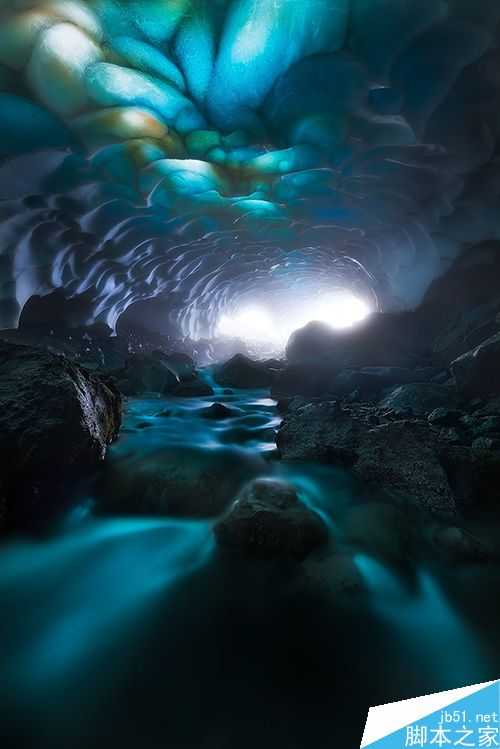 在这里我们也同样按照光的方向,集中增强画面光亮处主要颜色的亮度和饱和度来突出主体。在这张片子里主体是蓝色的水流引导线和雪洞的蓝色,暗处区域是黑色或者深蓝色一直随着光线强度变到浅蓝和白色。我只是轻微把对比度和整个画面蓝色增强一点点就已经达到Photoshop处理后的色彩效果。另外为了加强逆光光线的效果,我让高光处过曝了些,并且通过模糊加强了Raw文件里的水雾效果。