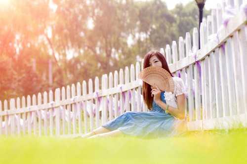 其中色彩也是关键,整个照片仅仅有着三块大颜色:草地与树的绿色,模特的蓝色以及栅栏的白色,其中绿色与蓝色是相近色,不过蓝色作为模特的主体颜色也正好略显突出,而白色是调和色,整个画面的色彩并不杂乱,显得干净简洁,这也是人像摄影比较关键的一点。