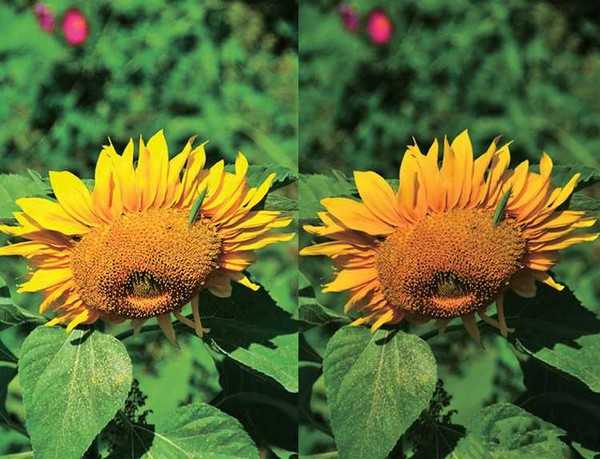 拍摄的向日葵,在拍摄时选择增加了一档曝光量,画面色彩鲜艳明亮;而较小的画面并未增加曝光量,直接拍摄,画面色调明显较暗。