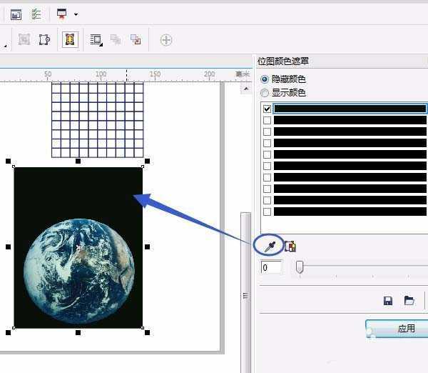 2、导入地球图片,选“位图”菜单→位图颜色遮罩,选“吸管”工具,对准图片黑色部分单击,再单击“应用”如图: