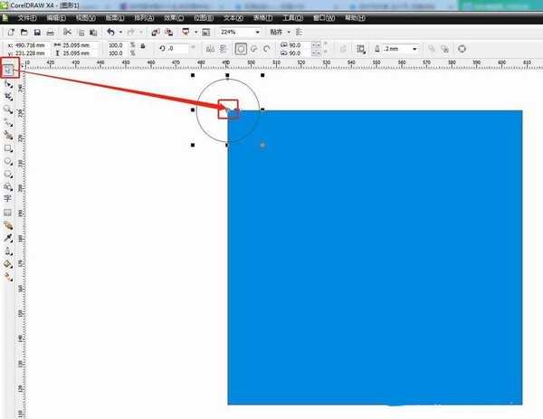 4、选择挑选工具,点击圆中心并拖动到方形边角