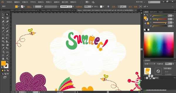 1、使用钢笔画出各种不同形状的夏花在背景的上面,再用绘制出字母让其艺术化呈现在背景的上方,左上角画出一只飞舞的蜜蜂形状。