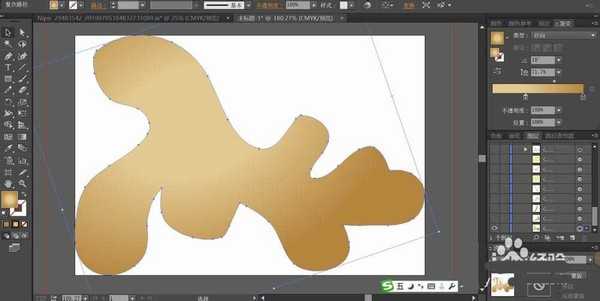 2、设置土灰色的渐变填充整个生姜的路径,让左侧上方为高光,右侧为暗光。在生姜的右侧边缘描绘出不同的暗光路径。