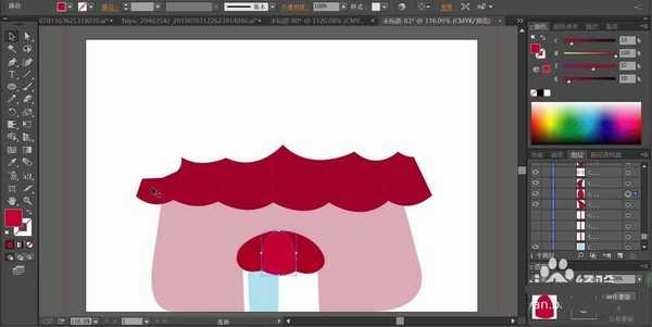 2、用月季红填充屋顶,用粉红色填充正面的墙壁。