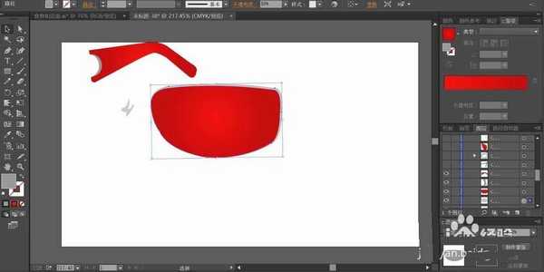 1、先用钢笔画出眼镜的一只镜片的形状再用红色的径向渐变填充。