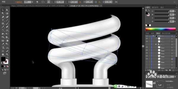 3、继续用钢笔画出灯管的一段旋转部位结构,我们用网格工具按照白灰白灰的次序进行变化,角度在30度左右。