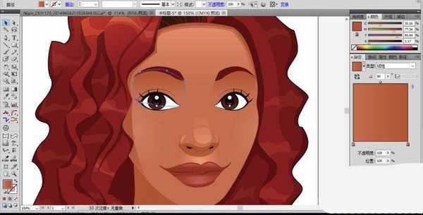 7、我们用灰黑色与咖啡色的渐变搭配填充眼晴的细节元素,用火红色的渐变填充嘴唇的高光路径,完成红发姑娘头像设计。