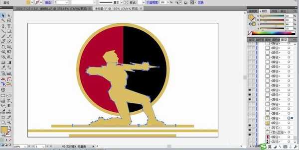 7、用金色填充人物的剪影,用金色填充地面所在的矩形。用金色填充半圆形外边缘的同心圆弧。