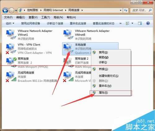 3、右击本地连接进入“属性”