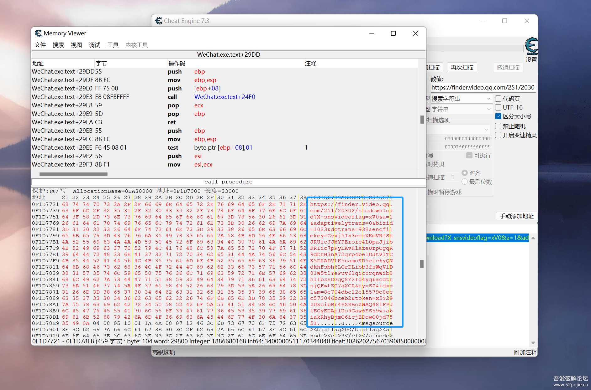 经窗口分析工具分析可得知,PC版视频号窗口为内嵌Chrome内核浏览器控件Chrome_RenderWidgetHostHWND,也就是该窗口只是一共浏览器调用了网址,直接从窗口截获Url地址尝试无果后,从内存尝试寻找后可行,可以直接内存搜索该控件视频地址。